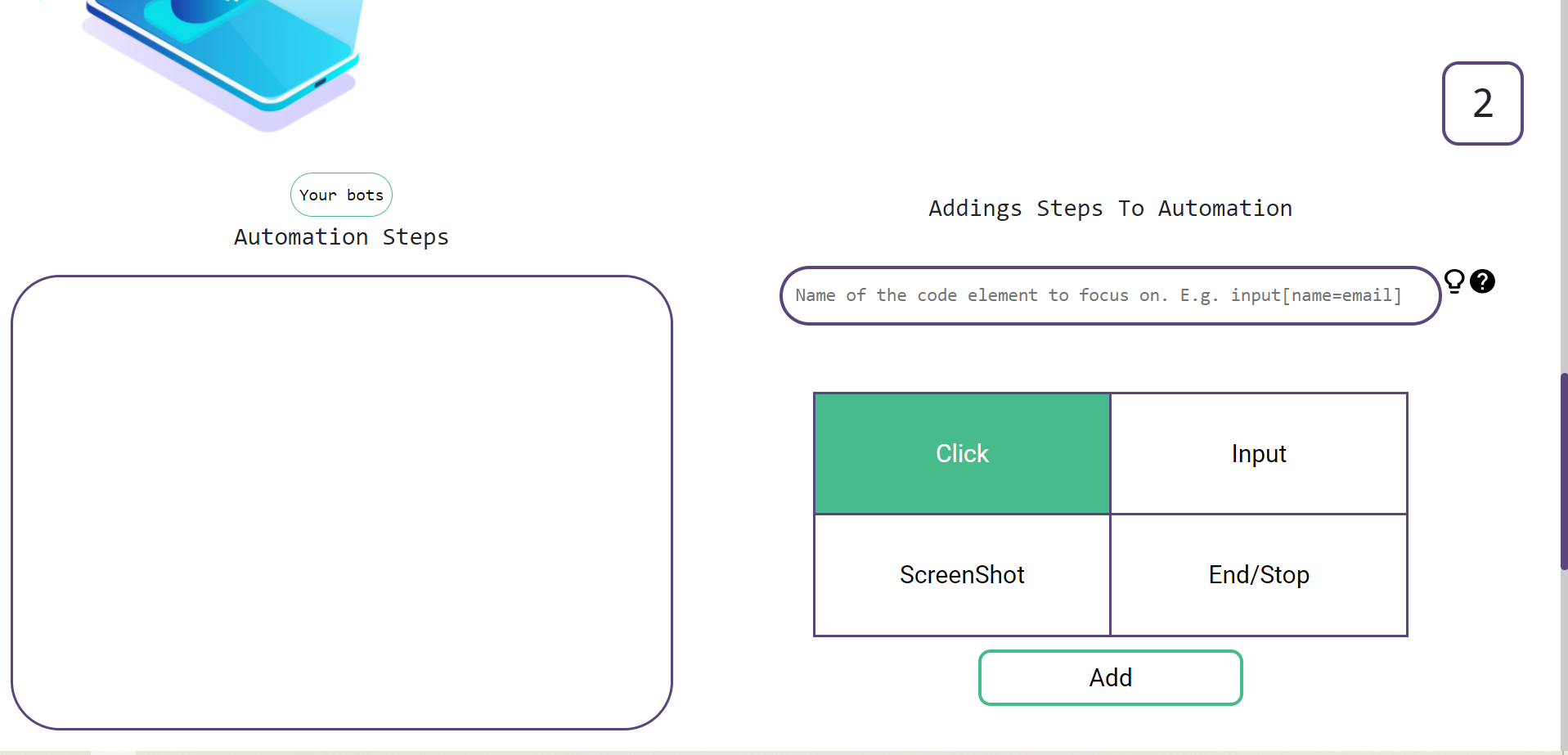 It allows user to create new accounts. Create, Edit & Delete bots at any time. Run the bots to execute commands. With helpful tips to get them started.